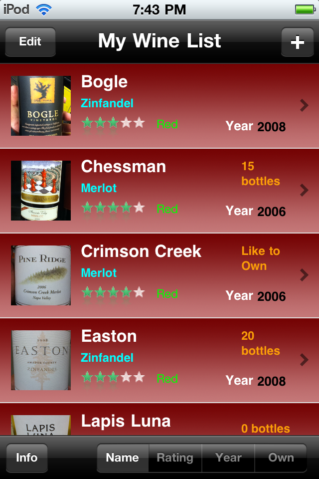 The Wine List helps user to sort their list by Name of Wine, Sort by Rating (Hight rating first), Sort by Year (old wine first) and sort by own it (lists all wine owned first).